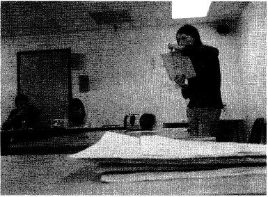 听力原文:(A) The woman standing is playing a cassette player. (B) The woman is pointing at