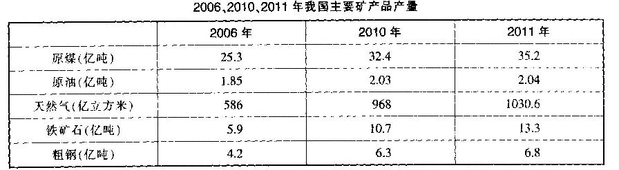 三、根据以下资料,回答106~110题。 截至2011年底,我国石油剩余技术可采储量4亿吨,天然气4.02万亿方;煤炭查明资源储量1.38万亿吨,铁矿743.9亿吨,铜矿8612万吨,铝土矿38.7亿吨,金矿7419吨。 2011年我国矿产资源勘查投资1118.2亿元,同比增长9.2%。其中.油气勘查投入674.7亿元.同比增长9.4%;非油气勘查投入443.5亿元,同比增长9%。 2011年,我国矿产品进出口贸易总额为9571亿美元,同比增长34.3%。从2006年至2010 年.原油进口由1.82亿吨增至2.76亿吨,年均增长11.O%;铁矿石进口由3.25亿吨增至6.19 亿吨,年均增长17.4%。2011年石油、铁矿石、铜、钾肥、铝等大宗矿产对外依存度(净进口量占全国消费量的比例)分别为56.7%、56.4%、71.4%、51.5%、61.5%,分别比2010年上升1.9、2.8、0.4、-0.9、8.6个百分点。