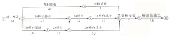 A公司承建城市道路改扩建工程,其中新建一座单跨简支桥梁,节点工期为90天,项目部编制了网络进度计划如图所示(单位:天)。