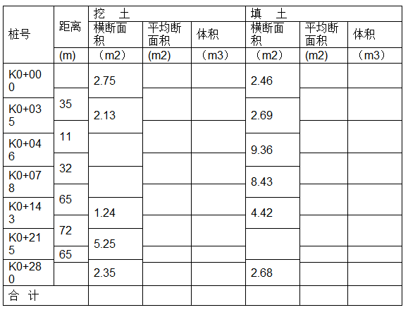 (本题10分)某新建道路工程全长280m,路宽7m,土壤类别为三类,填方要求密实度达到95%。请计算下列土方工程表,分别算出挖土和填土体积。