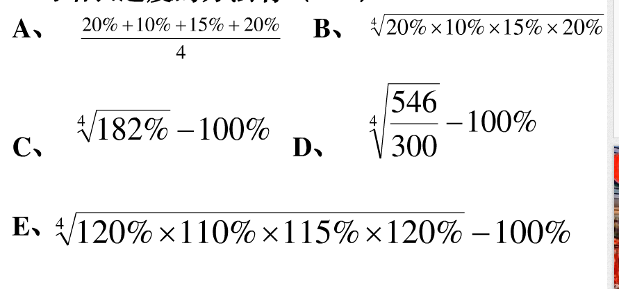 已知某人最近三年的收入环比增长速度分别为3% 4% 7% 那么其年平均增长速度为()。
