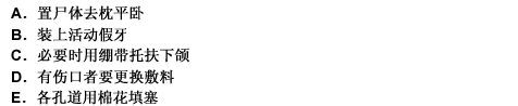 进行尸体护理时 下列做法不妥的是A.置尸体去枕平卧B.装上活动义齿C.必要时用绷带托扶下颌D.有伤