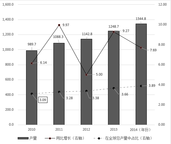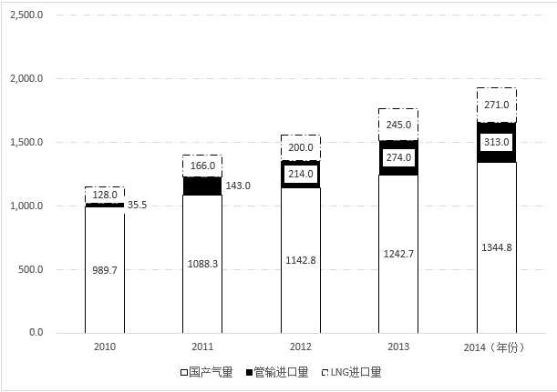 我国供气来源多元化,主要包括国产气和进口气两部分。国产气主要有常规天然气、页岩气和煤层气等,进口气主要有进口LNG和进口管输气。近年来,我国天然气供应量稳步增加,国产气、进口管输气、进口LNG都呈上涨趋势。国产气从2010年的989.7亿立方米增至2014年的1344.8亿立方米,增长了355.1亿立方米。进口管输气从2010年的35.5亿立方米增至2014年的313亿立方米,增长了7.82倍。