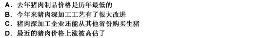 某市由于粮食价格上升带动饲料价格上涨,又发生了“生猪高热病”,养猪户由于猪价低而不愿意花钱给病猪治疗。致使该市大量肉猪死亡,养殖成本增加导致猪肉价格比去年同期上涨两倍。这就大大提高了猪肉深加工企业的成本,估计猪肉制品价格将有大幅度的提高。