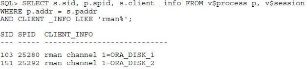 Multiple RMAN sessions are connected to the database instance.Examine the following output when backup commands are running in server sessions:What could have helped you to correlate server sessions with channels?()